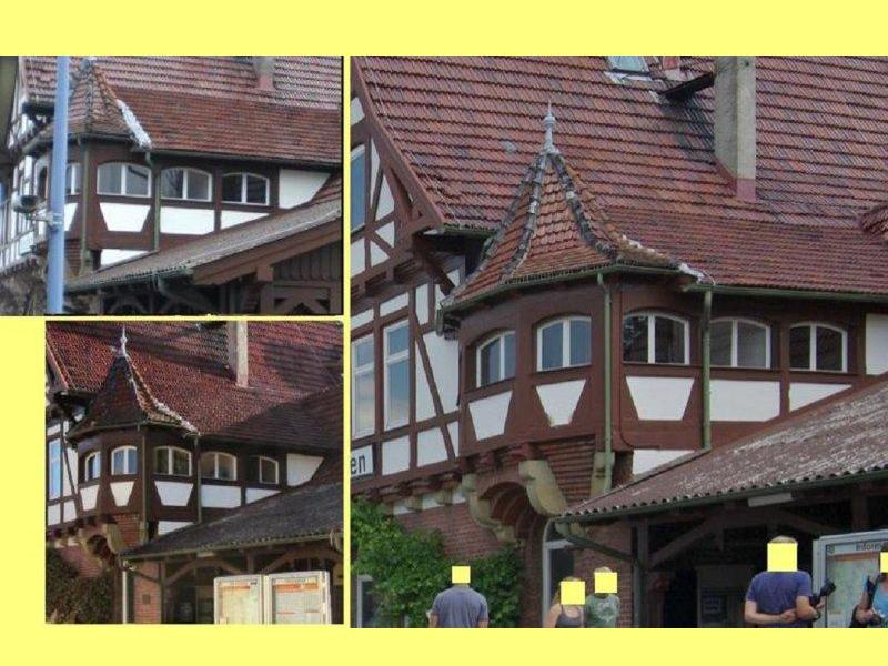 出窓の張り出し方が実物とキットで異なるためとんがり屋根と傾斜屋根の接続部分も実物とは違っていて (写真3枚目) 、この辺りそれらしく見せるには少し工夫しないといけなさそう。