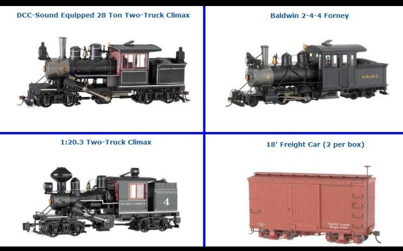 機関車は煙突やキャブ後ろの短さ、足台みたいなのが見えるからClimaxかHeislerだとおもうけど、スチームドームがキャブ屋根以上いってて、タマネギ煙突のってBachmann製品では見たことないから他の製品かもね。