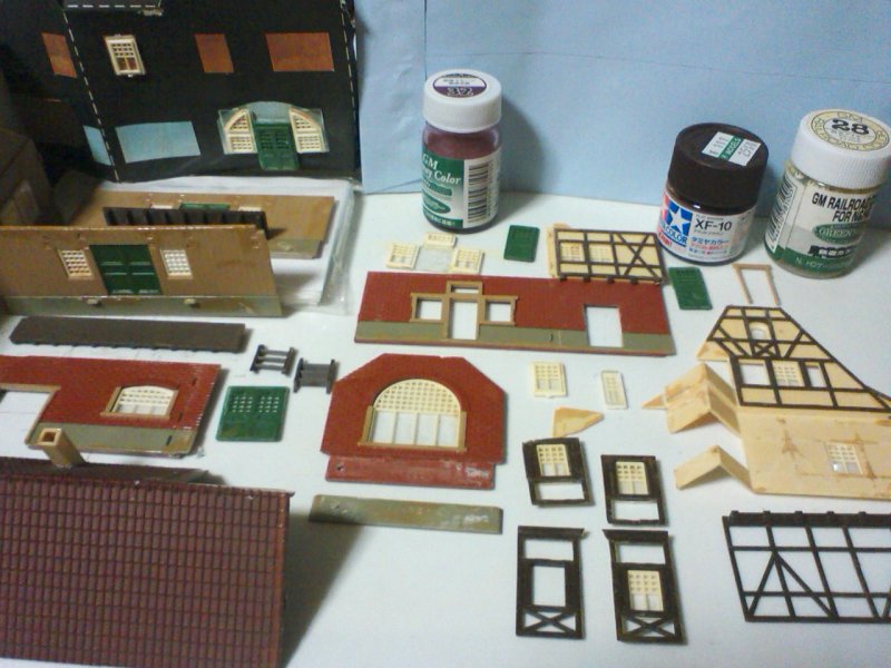 大体分解できたところで壁の塗装。2階以上の壁はGMカラーの西武アイボリーにしてみた。屋根は阪急マルーン、木枠はタミヤカラーのフラットブラウン。木枠が壁に完全に張り付いていて取れない部分は木枠ごと筆塗り。窓枠は可能な限り外して壁の厚みの部分も塗装。