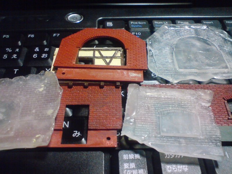 おゆまるを水を入れた皿に入れて電子レンジで3分。それを取り出してレンガ壁に押し付けて型取り。キオスク部分は窓とドアが一つずつだけど、上辺がわずかにアーチ を描いているのでアーチ窓のある壁を型取り。大アーチ壁も後で何かに使えそうなので型取り。それとドア・窓の側辺用にもう1枚。