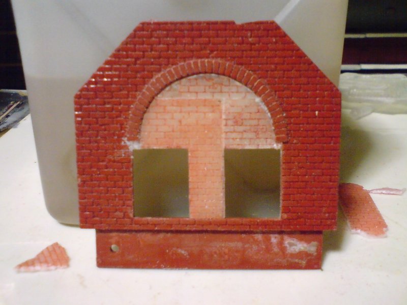 基礎の石部分も現物あわせで切り欠いてレンガ壁に接着。接続部分にスキマが出来たら、こちらも「接着剤+重曹」パテを使って裏から・表から埋める。レンガ壁や石のそれぞれの接続部分のパテが固まったらツライチにヤスってデザインナイフでレンガの目地を刻み込む。石の基礎部分は目地は不要なのでそのまま。そして開口部上辺に小アーチを薄くしたものを接着。これらの接着&パテには全て瞬間接着剤を使用している。