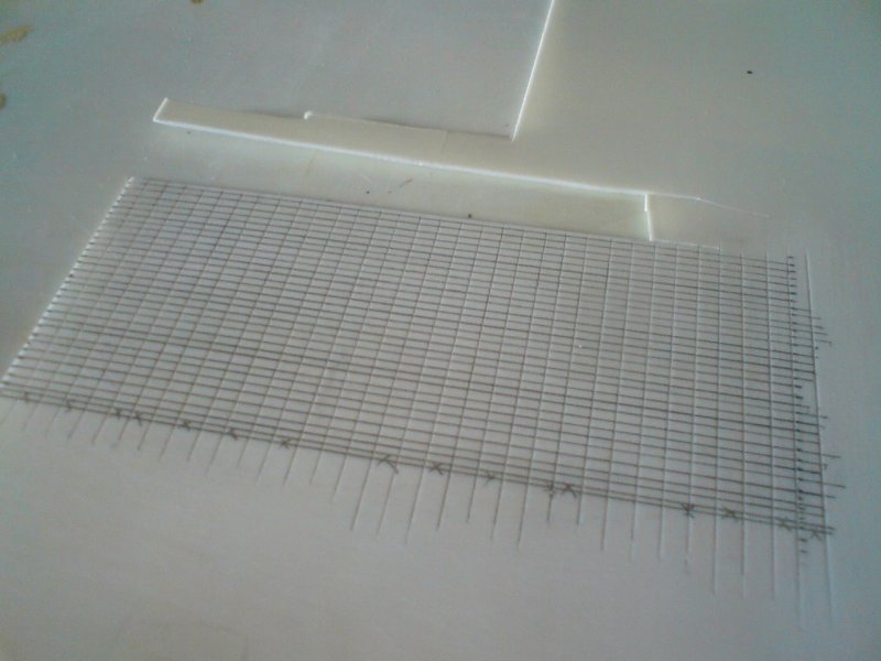 そして直角方向に今度は4mm3スパン (大体1.3mmずつ) で線を引き (写真7枚目) 、カッターで切り出した。プラ板の片方にはバラけるのを防止するため裏からマスキングテープを、すこしプラ板からはみ出させて貼り付けておいた (写真8枚目) 。カッターは普通のオルファのカッター。デザインナイフやPカッターを使わなかったのは刃の厚みや角度が何度も平行線を切るのに適していないと感じたため。