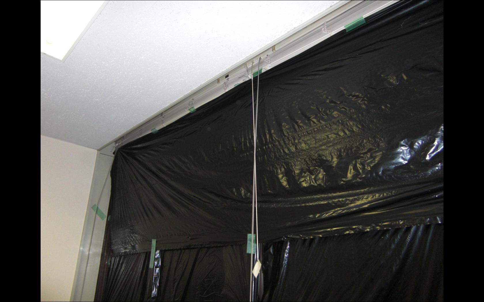 (左)設営前の会場。(中)カラオケ室から光が漏れないように目張り中。上半分の目張りはブラインドシャッターの下枠部に貼り付けるというお手軽手抜き仕様・・・・・・。(右)チラシ初公開。チラシをまく前に枠が埋まったとかで、他のイベントでは配られていない幻の一品とか。