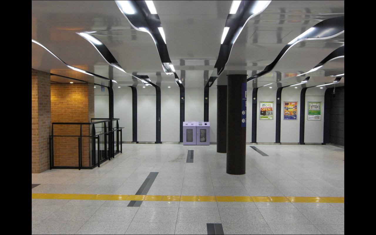東口の、今度は改札内。天井が波打っている。波打っている部分のスキマに照明が設置されていた。壁も天井の模様を連続させたもので、ロッカーや自販機、ゴミ箱がツライチに収まっている。かと思えば、反対側のゴミ箱は壁際においてあるという、統一感が既になくなっていて残念。