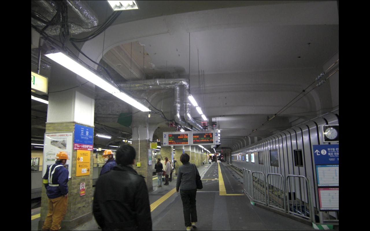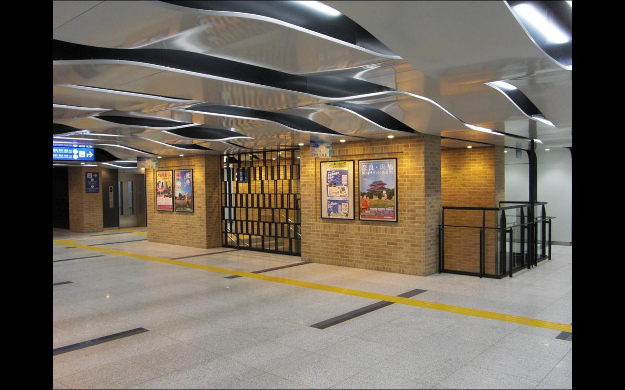 梅田寄りホームの延長部分。天井はコンコースと同様に波状となっていて、隙間に照明が設けられている。エレベーター手前部分は案内表示のために一段天井が下がっている。
