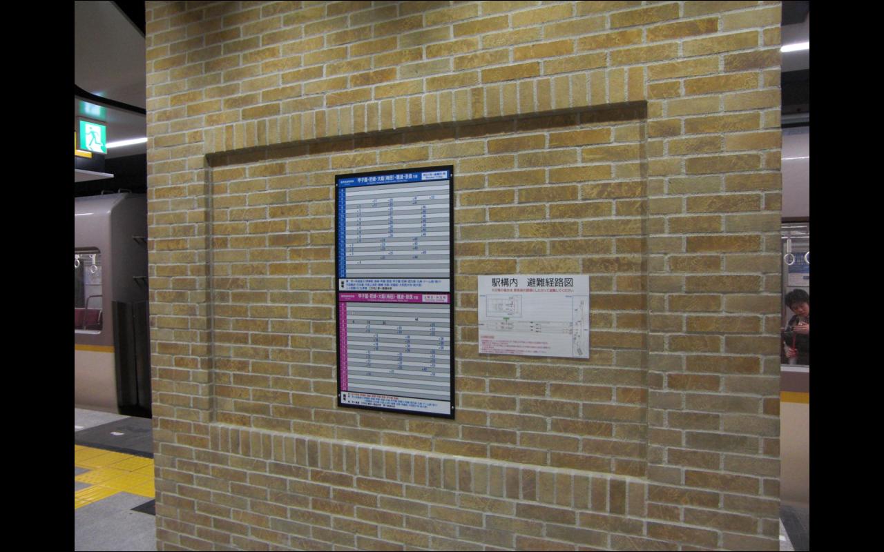 (左) :階段回りの柱は石積みのような壁材。広告部分が凹んでいるデザイン。これはホームの柱 (中) も同様。こういったデザインは流行なんだろうか? 以前、見かけたレンガ壁 (右) にデザインが似ている。