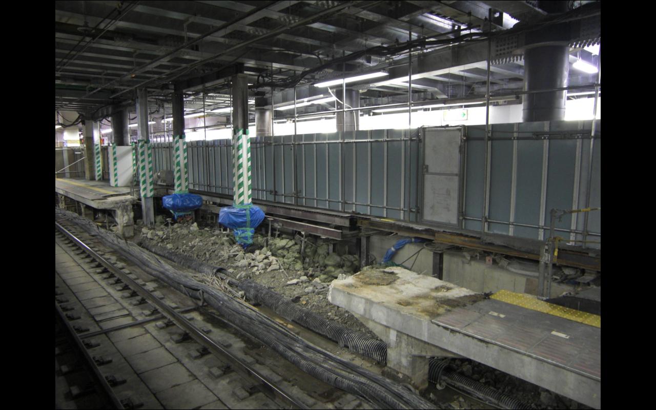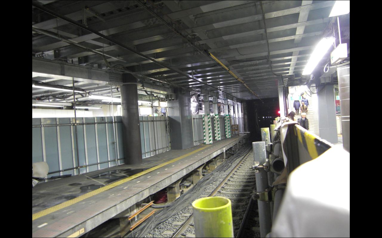 (右) : (中) の反対向き。壁側ホームは仮設となっていた。後はこの仮設ホームの下に線路を敷き、西口階段を撤去すると1番線はほぼ完成になるはず。