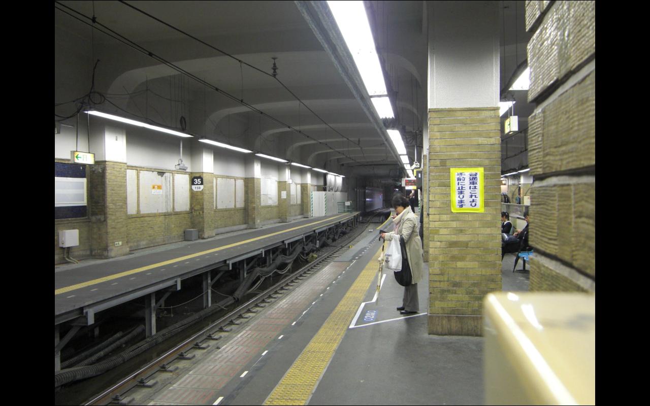 (中) : (左) よりも梅田寄りの部分、ここから壁側に線路がずれる。