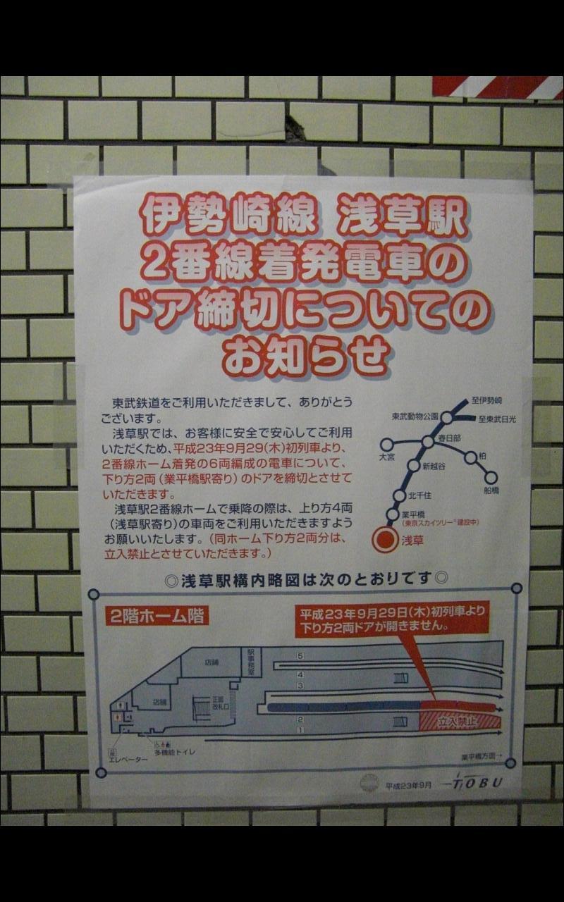 「東武鉄道をご利用いただきまして、ありがとうございます。浅草駅では、お客様に安全で安心してご利用いただくため、平成23年9月29日 (木) 初列車より、2番線ホーム着発の6両編成の電車について、下り方2両 (業平橋駅寄り) のドアを締切とさせていただきます。浅草駅2番線ホームで御乗降の際は、上り方4両 (浅草駅寄り) の車両をご利用いただきますようお願いいたします。 (同ホーム下り方2両分は、立ち入り禁止とさせていただきます。) 」
