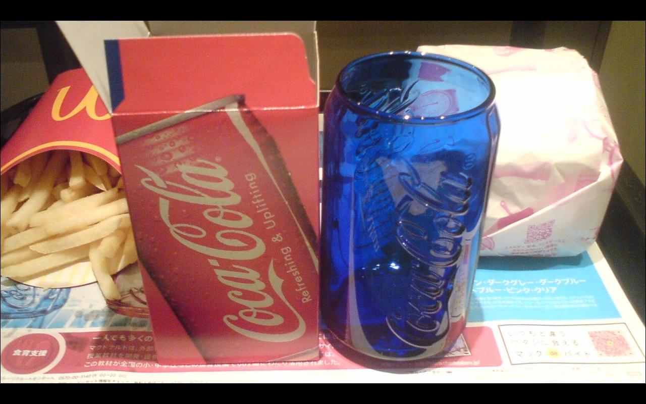 昨日、物は試しに行ってみてLLセットを頼んだら出てきたのが、コレ。青いガラスカップ。まるで「瑠璃」のような感じ。