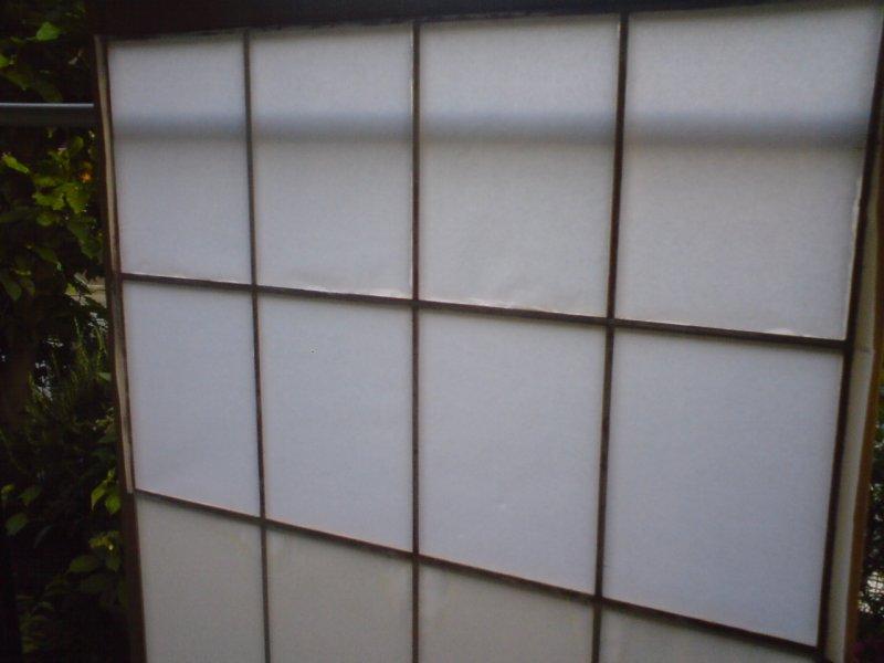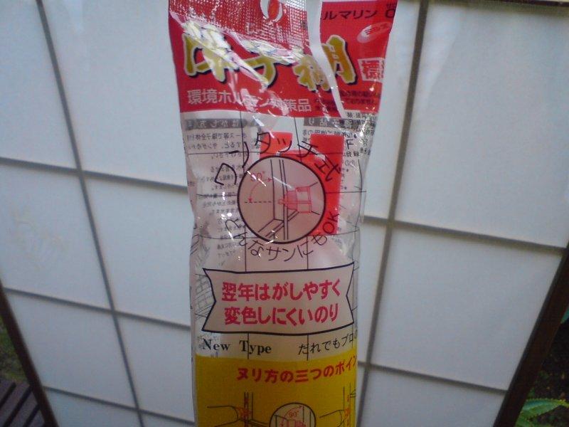 写真左は障子を上下反転させた状態で、最上段右側が元々破れていた所。手で剥がした後で障子紙の説明書を見たら木枠に水を付けると書いてあって(最初は読まなかった・・・)説明書どおりにしたらノリがふやかけたので2段分きれいに剥がせました。