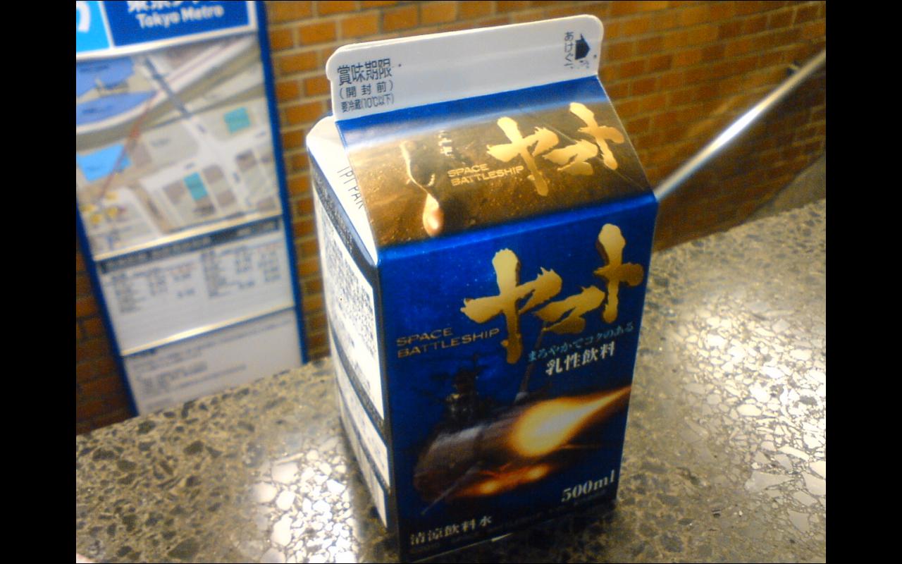 11月2日の時点で、『宇宙戦艦ヤマト』とのみパッケージに書かれた乳飲料らしきものをコンビニで発見。今度買って飲んでみようと思います。確かエルビーだったと思います。