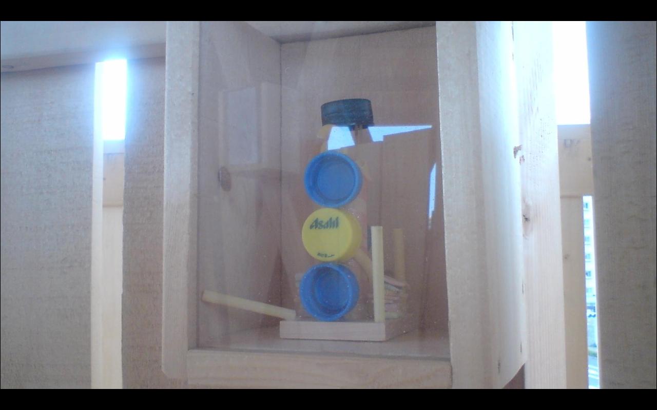ペットボトルの蓋で作られたオブジェが中に飾られている。