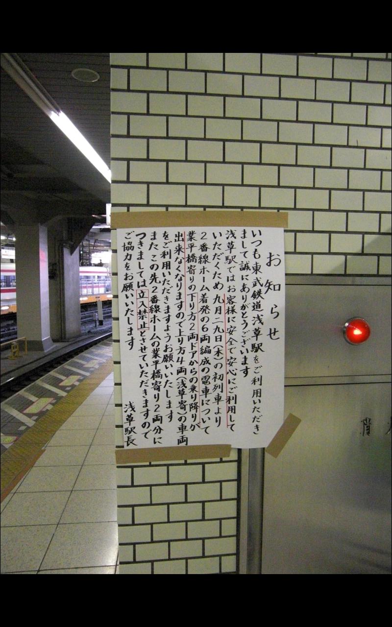 今回は業平橋から乗って浅草まで往復したわけで、普段乗らないから一駅130円かと思って業平橋で切符買ったら140円でびっくり。業平橋駅も東武館のほうの昔からの入り口が閉鎖されてあたらしく公団の高層住宅側に改札口が出来ていた。この辺も後で撮ってこようと思う。