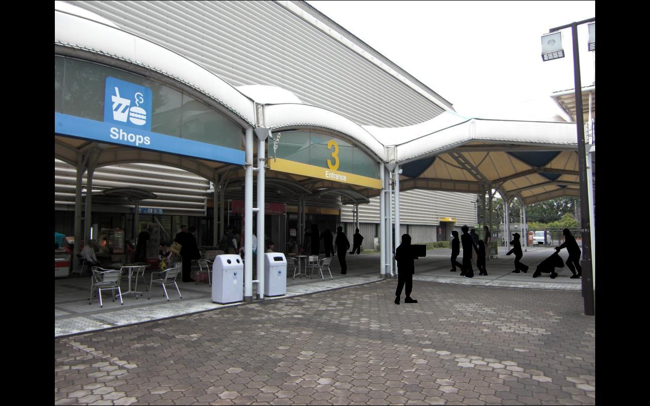 写真は左からインテックスプラザ、設営前の4号館、フリマをやっていた3号館。