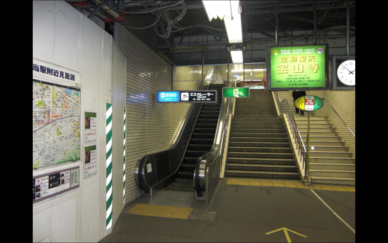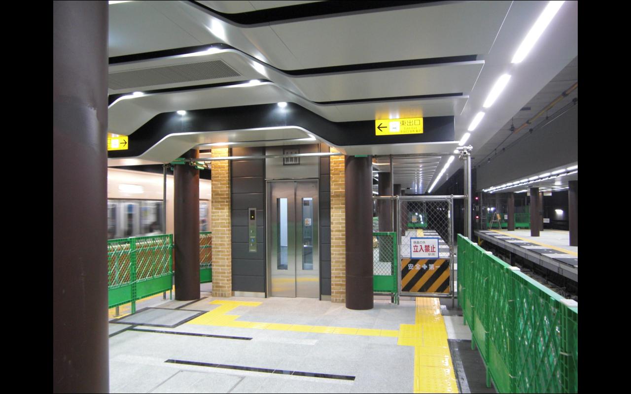 梅田寄りホームの延長部分。天井はコンコースと同様に波状となっていて、隙間に照明が設けられている。エレベーター手前部分は案内表示のために一段天井が下がっている。