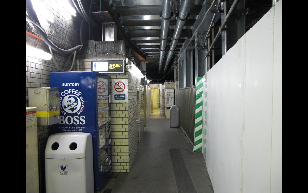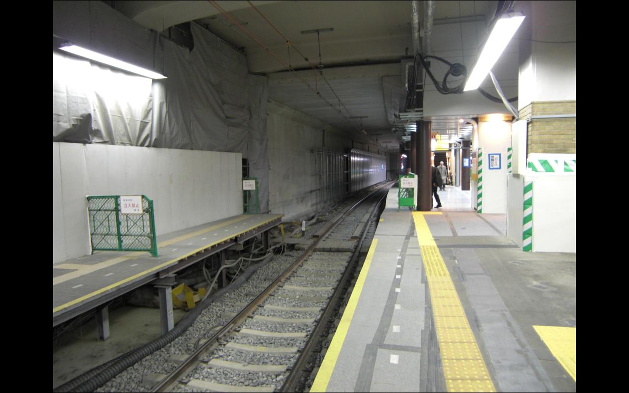 (右) : (中) の反対向き。壁側ホームは仮設となっていた。後はこの仮設ホームの下に線路を敷き、西口階段を撤去すると1番線はほぼ完成になるはず。