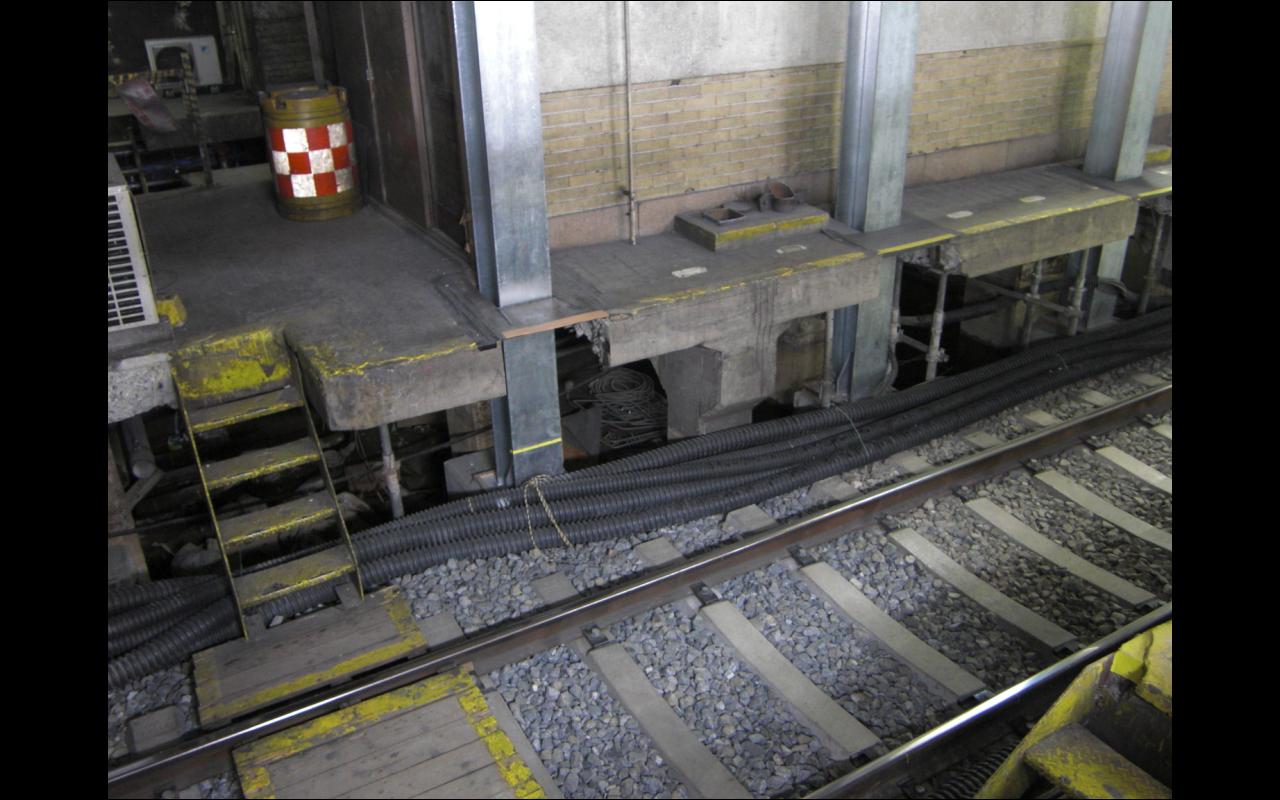 2番線。天井は新しく作られず、トンネル構造物のアーチ状の梁を見せる形で保存されるとのこと。そのためか、架線部分の天井部になにか塗りつけられていた。3番線の天井は白いペンキか何かできれいに塗装されていた。
