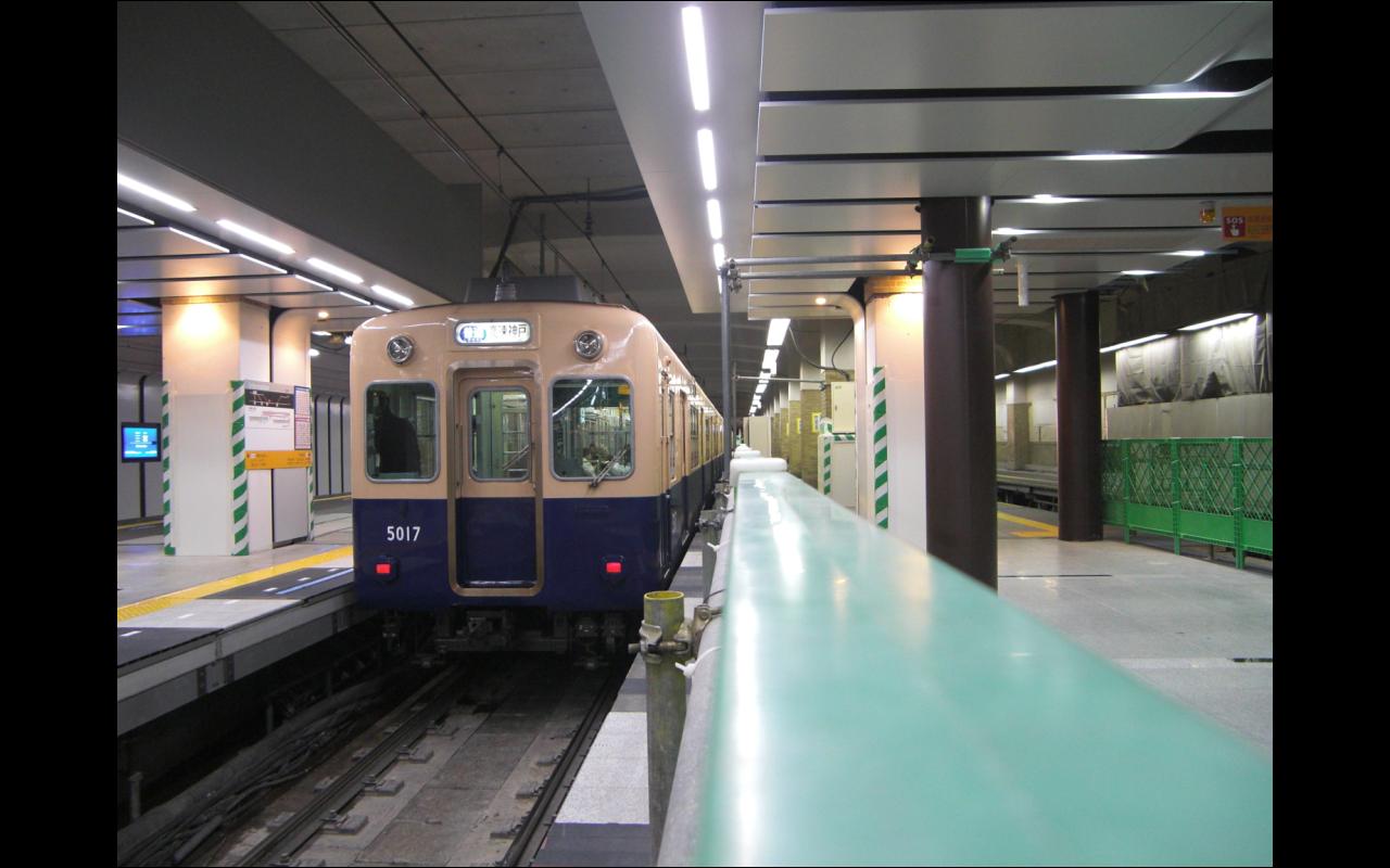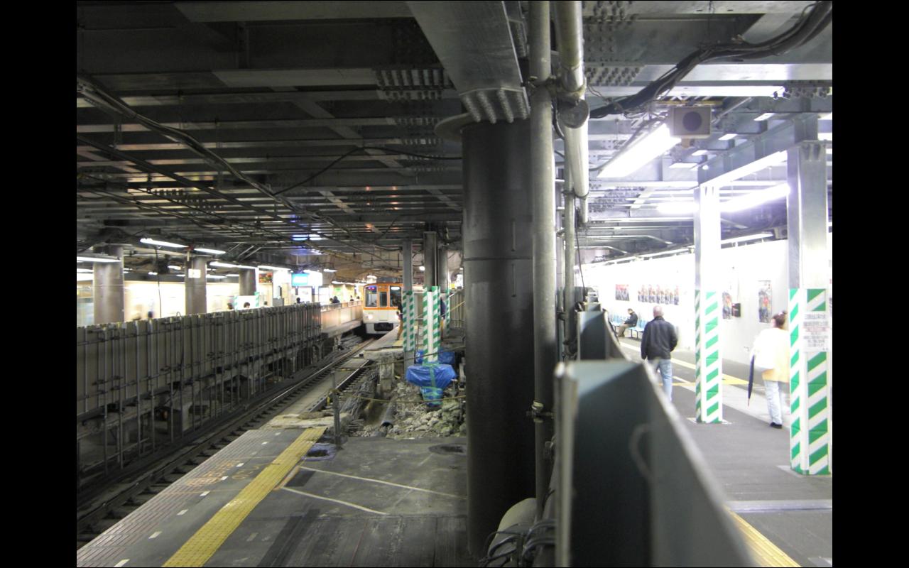 新設部分のホーム床面に張られた黒い部分が気になる。なんだろう? ホームドアでも作るんだろうか。それともドア位置知らせのマーカーでもつけるのか。近鉄が4ドア、阪神が3ドアではホームドアを設置しにくいと思う。
