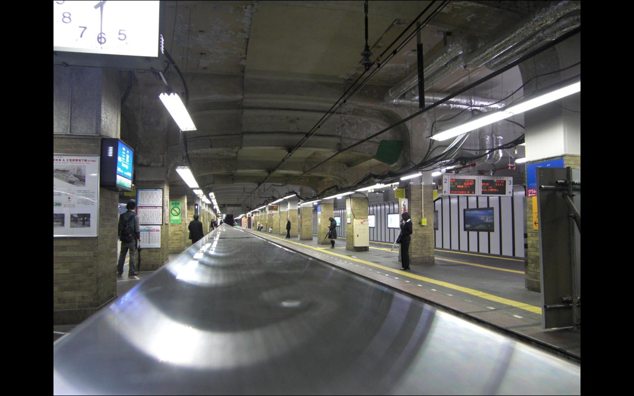 (右) :3番線車止めから元町方向。このエスカレーターと階段の間の部分に昔は線路があったらしい。