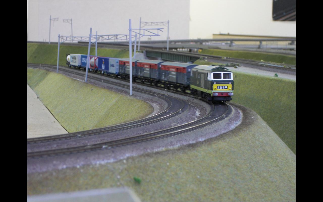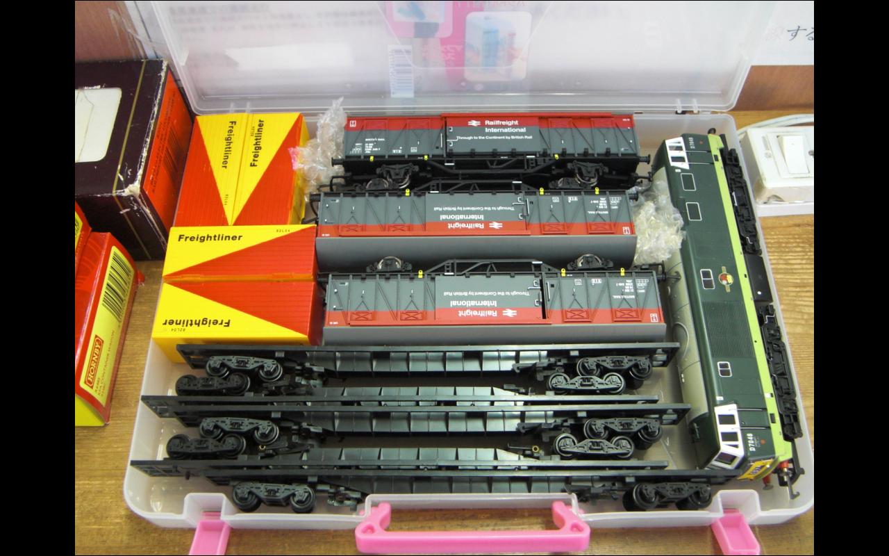 持っていったのはHornbyのOOゲージ貨物列車。ディーゼル機関車は箱が大きく嵩張るのでA4ケースに詰め込んだ。縦に。