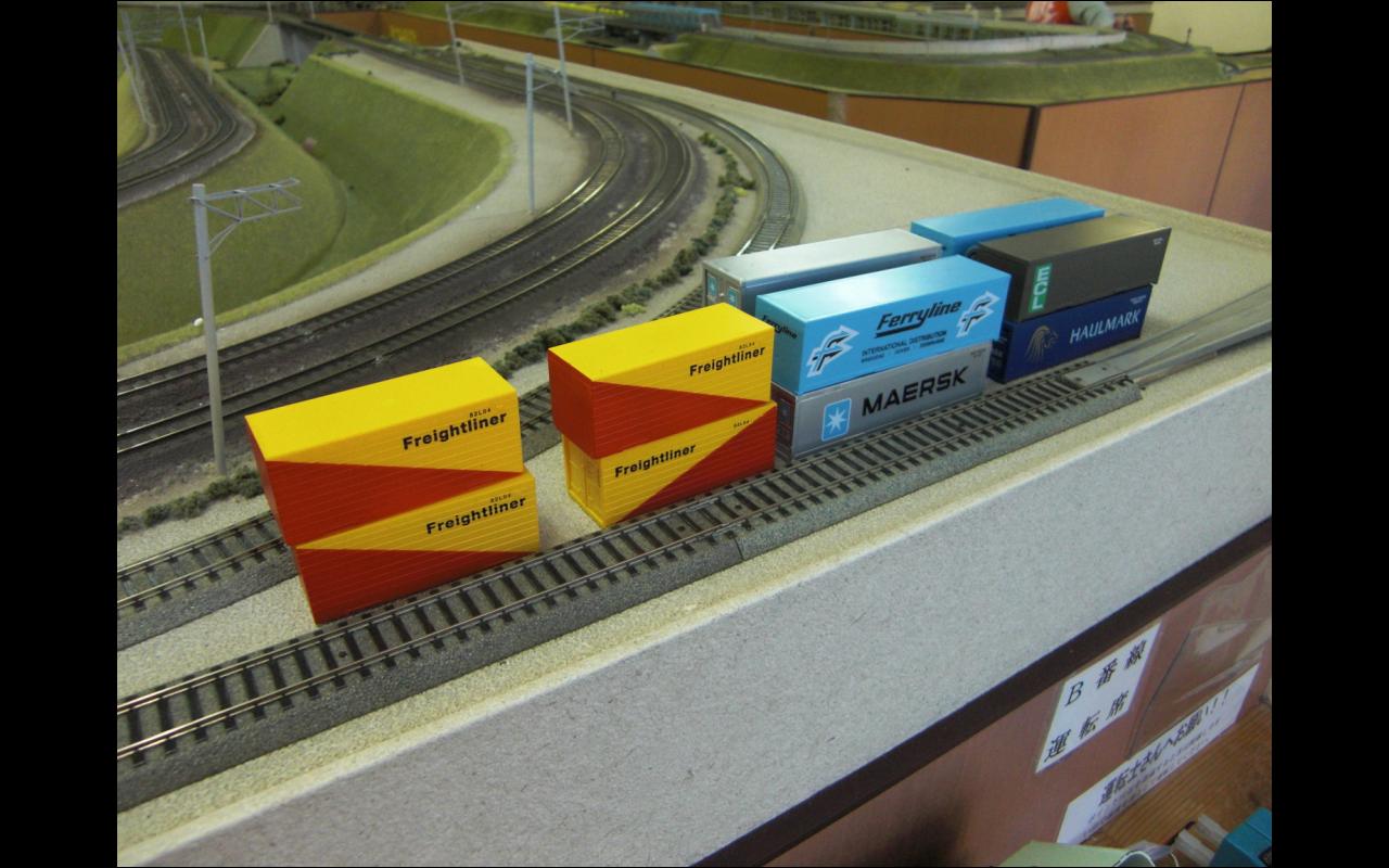 コ ンテナは40ftと20ftの組み合わせのもの(写真左・奥)と、バラの30ftと20ftのもの(写真中)を持っていった。バラの20ft・30ftは 写真右の黒いコンテナ車に載せるもの。バッファーが付いていないのは、実際に昔バッファー無しのコンテナ車があったとかで、それを模型化したとか。