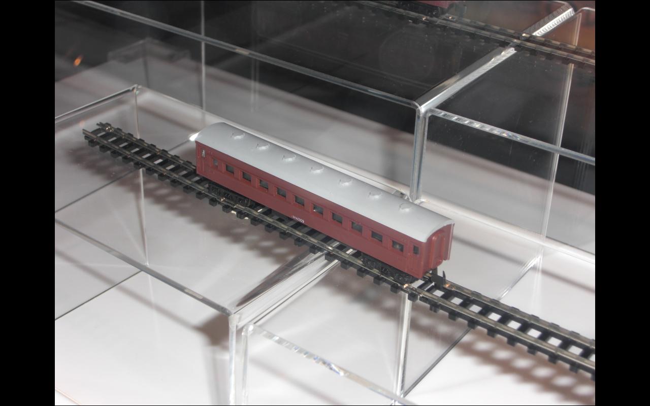 こちらは客車。殆どプラ製で現行Nゲージ製品とそう変わり無い構造で屋根と車体、床板に分割されるようだ。長さはちょっと短い気がする。妻板や貫通ドアの表現はあっさりしている。側面の造型を見るに、機関車もプラ車体でよかったと思える。牽引時の粘着重量は車体内部にウエイトを乗せれば解決するだろうし。