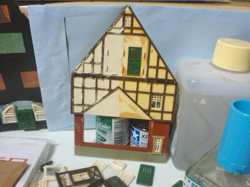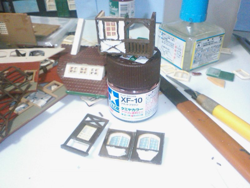 窓回りと壁の木枠部分は壁とは元々別パーツ。ただ元の製作者が接着済みだったので剥がせるところは剥がしてタミヤのフラットブラウンで塗装した。レンガ壁の下辺、コンクリートか石?の部分もなんとか剥がしてみた。