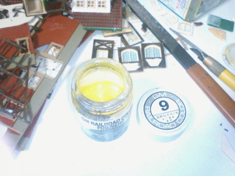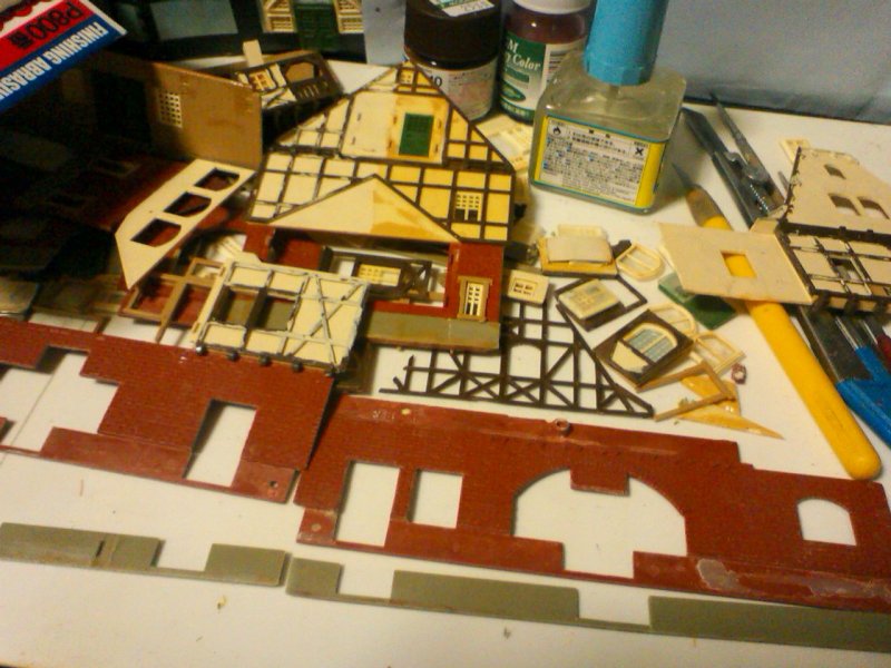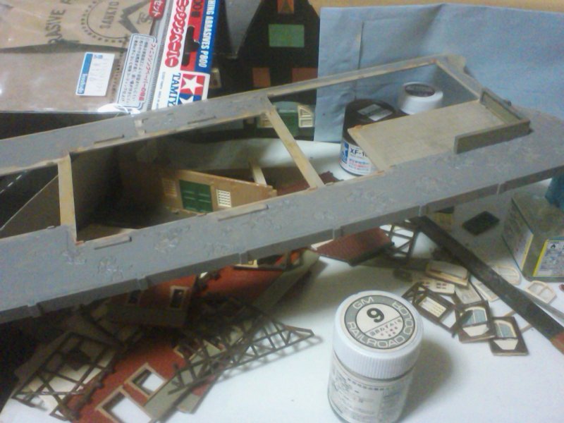 大体分解できたところで壁の塗装。2階以上の壁はGMカラーの西武アイボリーにしてみた。屋根は阪急マルーン、木枠はタミヤカラーのフラットブラウン。木枠が壁に完全に張り付いていて取れない部分は木枠ごと筆塗り。窓枠は可能な限り外して壁の厚みの部分も塗装。