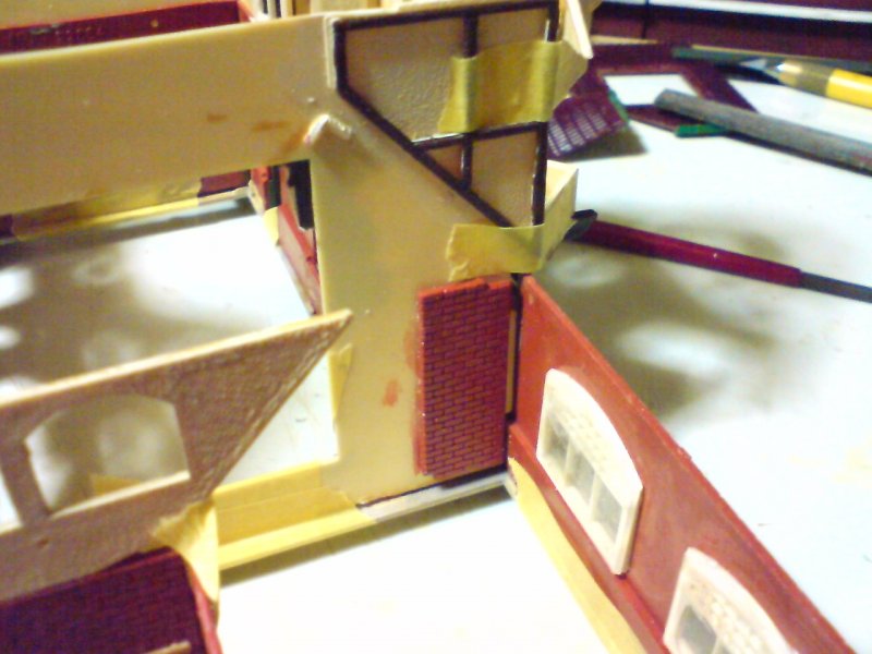 写真3枚目のクリーム色壁の1階部分に不思議なレンガパーツが接着されていた。建物の内側に入る箇所だからここにあるのは変なわけで、おそらく元の製作者が反対側につけるべきパーツを間違えて貼ってしまったのだろうと推測。反対側は建物正面側の袋小路になった壁にあたる。