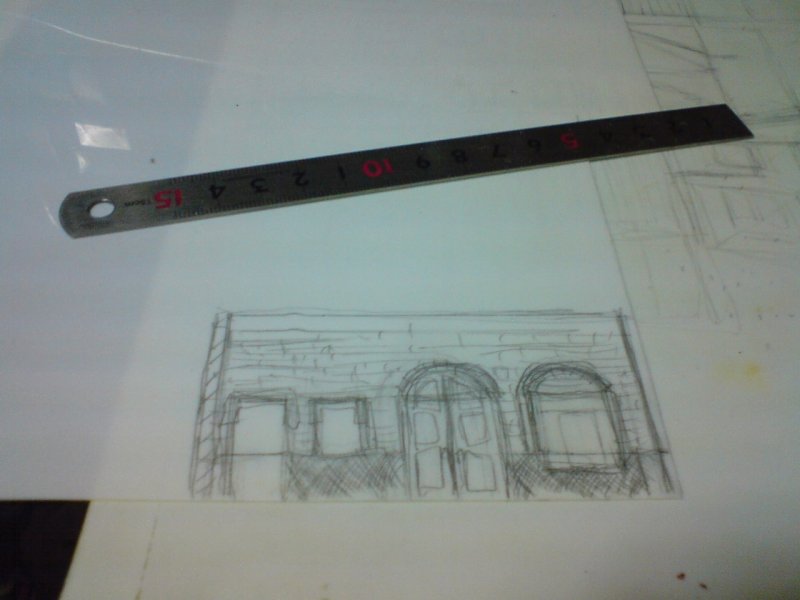 どうやらこの壁の部分にはキオスクの販売用の窓とドア、小窓と小さいドアがあるようにみえたので少々窮屈ながらもプラ板に書いてみた。もしかしたらキットは狭めにデフォルメされているのかも?