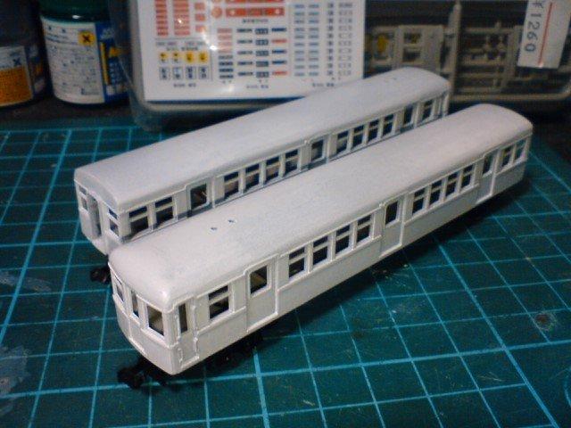 工作は、3両とも連結面妻板を全部平面としたので、キットの折妻の裏からスジを入れて平らにして、シルヘッダともどもヤスリで平らに均す。シルヘッダは車体を箱に組んだ後で0.3mmプラ板を細切りにしたものを貼り付け。