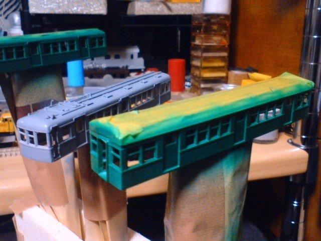 いきなり飛んで、塗装中の状態。工作途中の写真が無いものの、床下機器とか結構凝ったつもり。写真撮って置けば良かったとちょっと後悔。