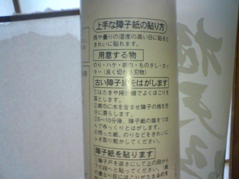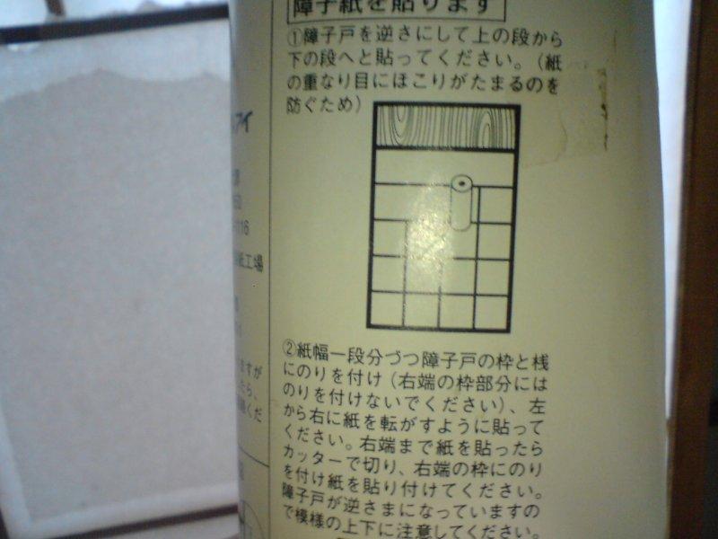 写真左は障子を上下反転させた状態で、最上段右側が元々破れていた所。手で剥がした後で障子紙の説明書を見たら木枠に水を付けると書いてあって(最初は読まなかった・・・)説明書どおりにしたらノリがふやかけたので2段分きれいに剥がせました。
